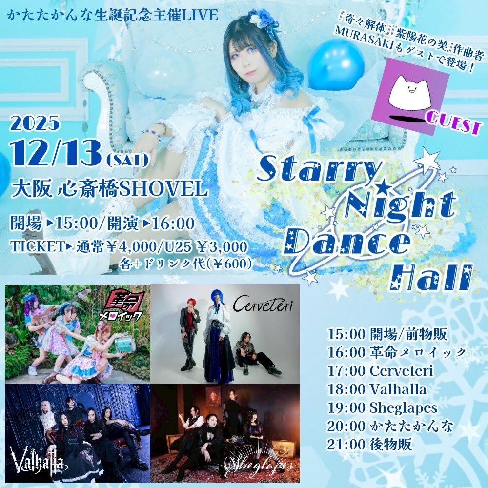 かたたかんな生誕記念LIVE2025 Starry Night Dance Hall vol.2 SCHEDULE 2025/12/13(土) 大阪 心斎橋SHOVEL 地図を表示 OPEN 15:00/START 16:00 かたたかんな/MURASAKI 革命メロイック/Cerveteri/Valhalla/Sheglapes 通常 ¥4000 / U25(25歳以下) ¥3000(各+1D) 取り置きURL URLをコピーする 報告する