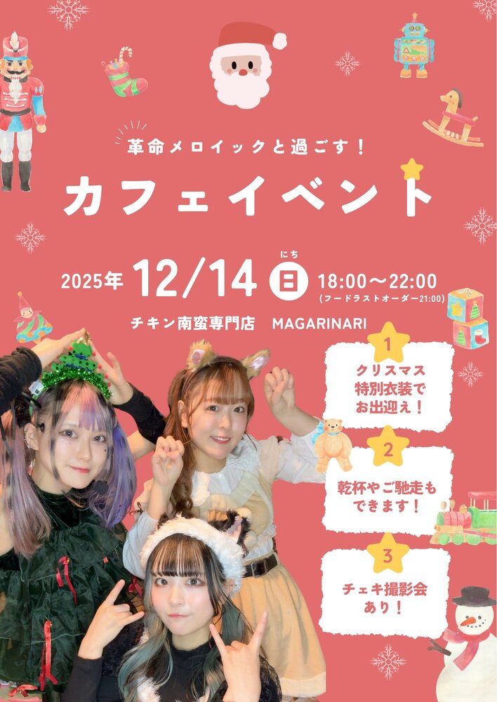 MAGARINARI クリスマスカフェイベント SCHEDULE 2025/12/14(日) 18:00 - 22:00 チキン南蛮専門店MAGARINARI 地図を表示 革命メロイックとクリスマス気分で美味しいチキン南蛮を食べよう! クリスマス衣装に、チェキも撮れます! お席予約フォーム URLをコピーする 報告する